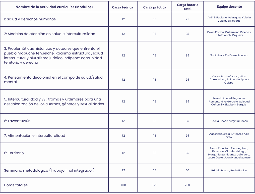 - Contribuir a que los/las diplomandos/as logren reconocer los fundamentos teóricos de las ciencias sociales que permitan problematizar las prácticas de salud desde una perspectiva intercultural, con énfasis en el sistema de salud de pueblos originarios de Patagonia.